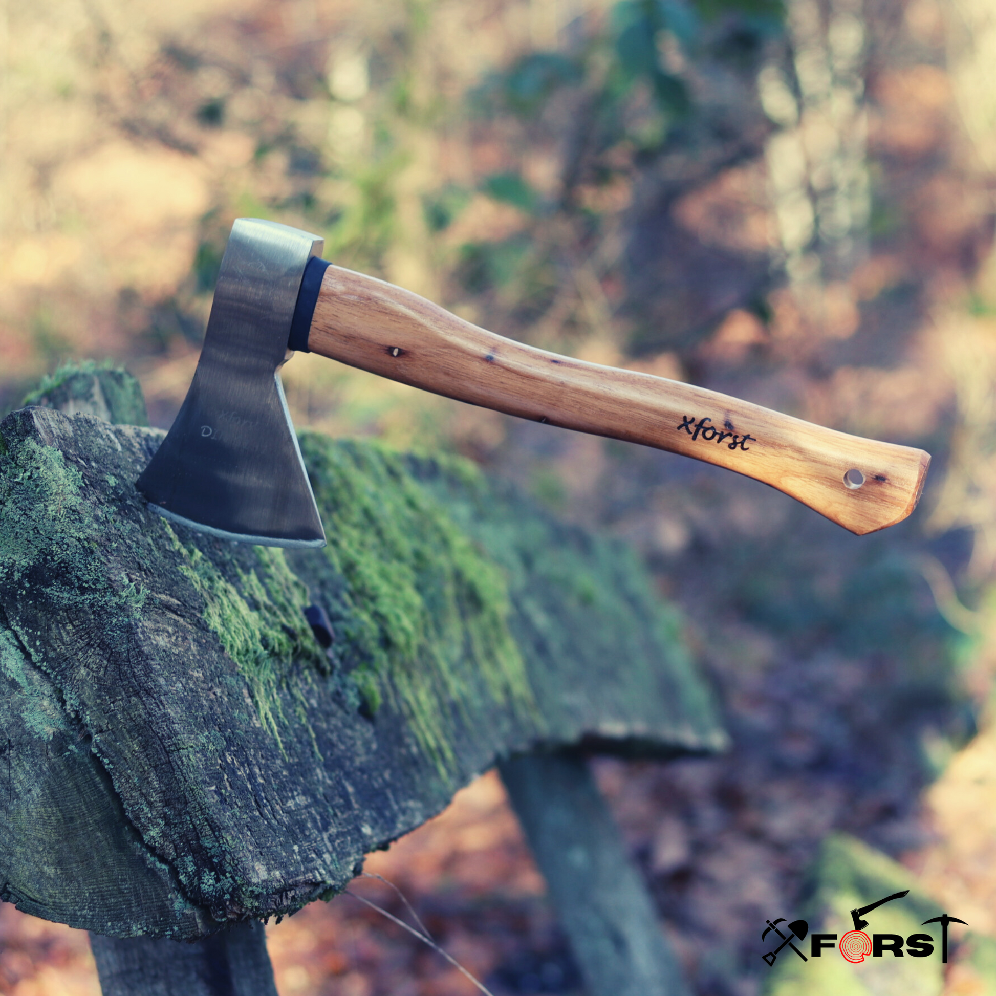 HacheXforst avec manche en bois de Hickory. Inclut une pierre Ă aiguiser.